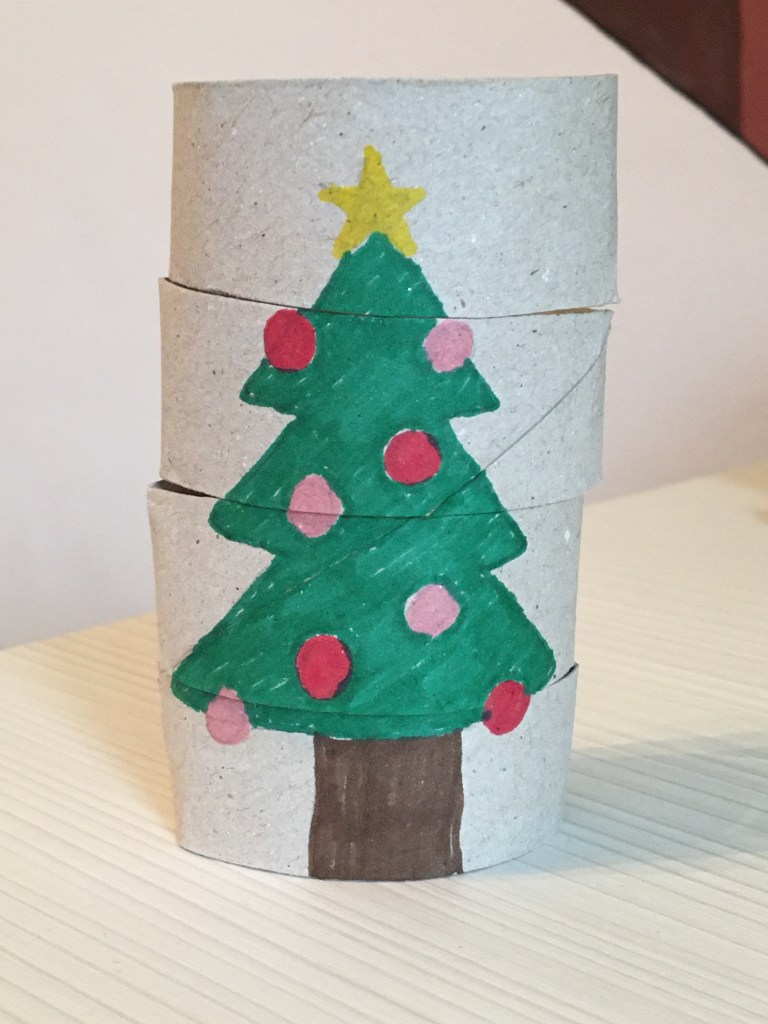 Fate un disegno con la matita sul rotolo di carta igienica (io ho scelto un albero di Natale, ma potete ricreare qualunque immagine, non necessariamente natalizia).