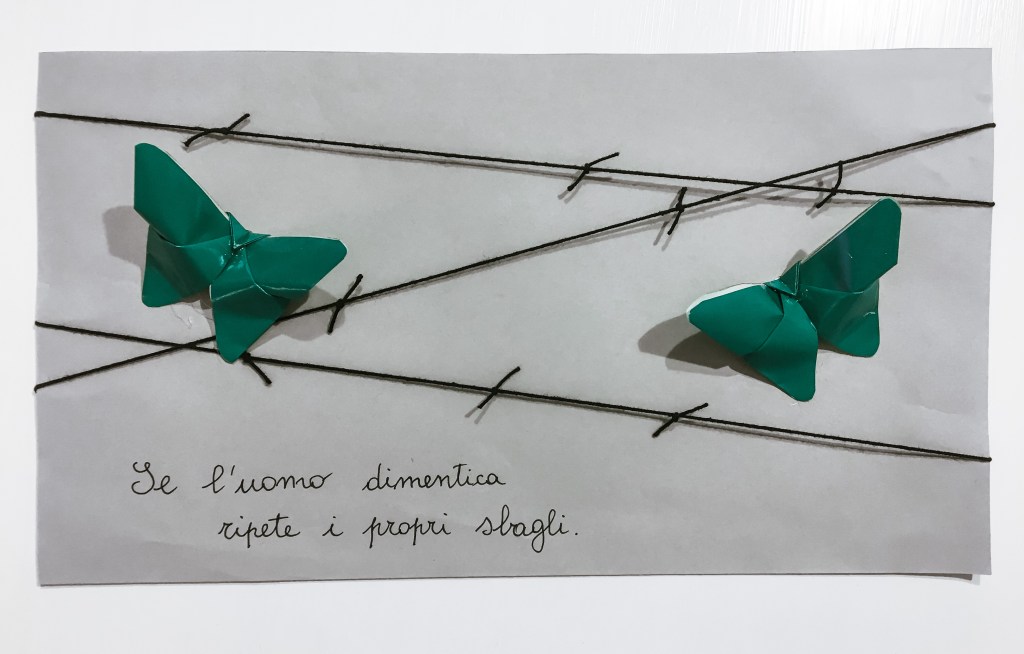 Innanzitutto ho tagliato tre pezzi di filo leggermente più lunghi del foglio in modo che potessero essere fermati dietro con dello scotch. Ad ogni filo ho annodato 2 o 3 pezzettini più corti per creare una specie di filo spinato. Ho poi scritto la frase (potete scegliere quella che ritenete più adatta in base all’età dei vostri alunni, o semplicemente Giorno della Memoria – 27 gennaio). Infine ho realizzato le farfalle seguendo un tutorial molto chiaro che ho trovato su internet (ve lo allego qui sotto) e le ho incollate sul foglio utilizzando la colla a caldo.
