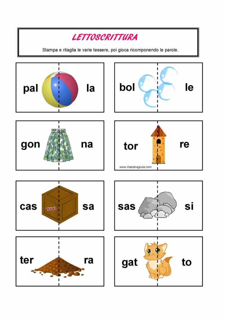 - stampate una copia per ogni bambino (o ne stampate una e poi la fotocopiate perché mi rendo conto che le stampe a colori sono costose). Ad ogni alunno darete le varie tessere già tagliate; l’esercizio può consistere nel ricomporre le varie parole ed incollare le tessere accoppiate sul quaderno. Volendo si può anche chiedere loro di riscrivere sotto la parola.