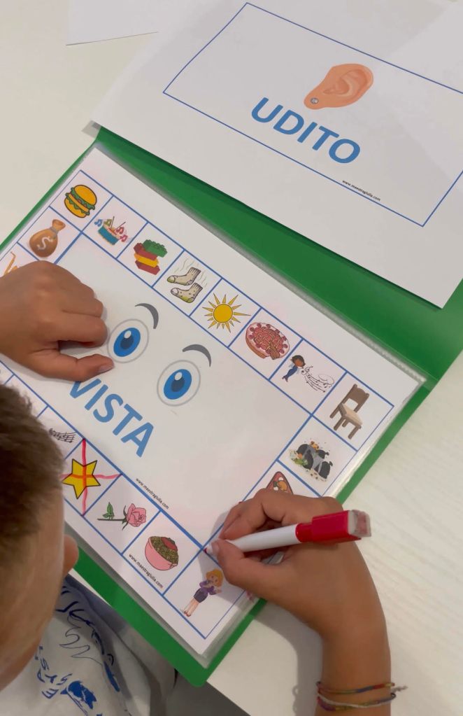 I bambini dovranno contrassegnare, di volta in volta, i disegni corrispondenti con un pennarello per lavagne oppure, se preferisci, puoi dare loro delle mollettine da pinzare sulle immagini giuste.