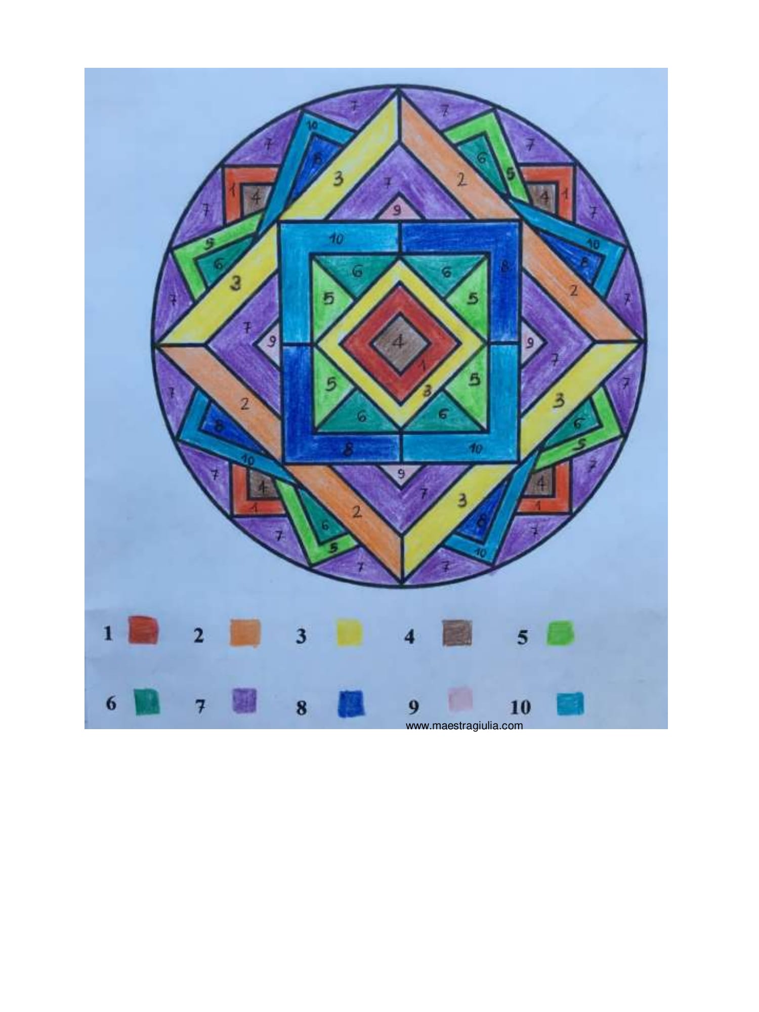 Nella scheda per gli alunni i quadratini affianco ai numeri (quelli sotto il mandala) sono in bianco e nero per permettervi di fare le fotocopie. Nella seconda immagine potete vedere, invece, come verrà il lavoro finito e i colori che io ho associato ai numeri. Basterà , all’inizio dell’attività , far colorare ai bambini i quadratini accanto ad ogni numero, in questo modo riusciranno a proseguire con la coloritura del mandala in autonomia. (Potete anche scegliere colori diversi dai miei).